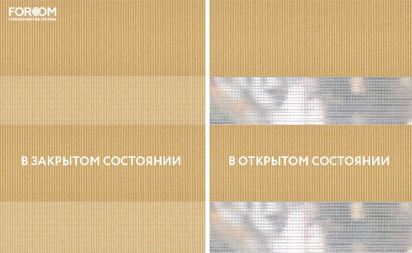 Полотно ткани, состоит из чередующихся горизонтальных полос – прозрачных и непрозрачных. Изменяя положение этих полос относительно друг другу, можно создать целых 3 режима регулировки светом. Например, чтобы в помещении стало светлее, нужно расположить прозрачные полосы друг напротив друга. Если разместить прозрачную и непрозрачную полосу параллельно друг другу, то можно добиться практически полного затемнения.